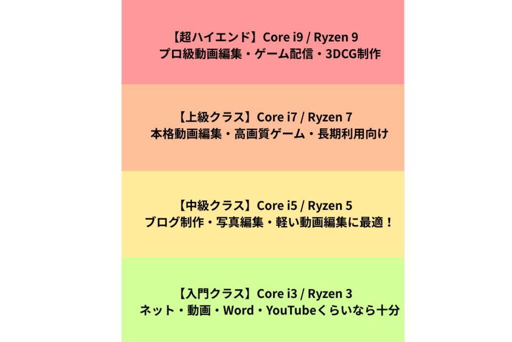 ランク | Intel(例) | AMD Ryzen(例) | 性能の目安 | 主な用途 |